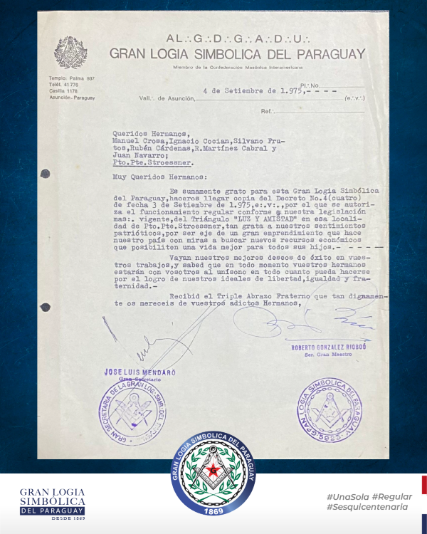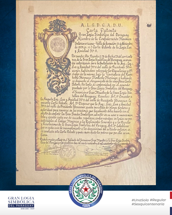 Porque la historia no vive en ladrillos, sino en los documentos que la testimonian. Durante su cincuentenario, la Augusta y Respetable Logia Luz y Amistad Nº 11, pionera de la Masonería regular en Ciudad del Este, exhibió con orgullo su Carta Patente fundacional (1.975), Decreto Constitutivo y otras piezas históricas de gran valor masónico.